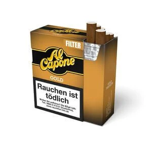 Al Capone Pockets Gold Filter von Dannemann ist aus klassischen amerikanischen Virginia Tabaken mit Filter, die in ihre natürliche Blattverpackung gerollt werden. Ein vollmundiger Geschmack, mit einer angenehm cremigen Kaffeenote. Leicht süß und eine echter Gaumenschmeichler. Ein angenehmer Rauchgenuss für den Raucher, der es mild und aromatisch als kleine „Kaffeepause“ der anderen Art geniessen möchte.